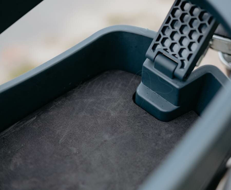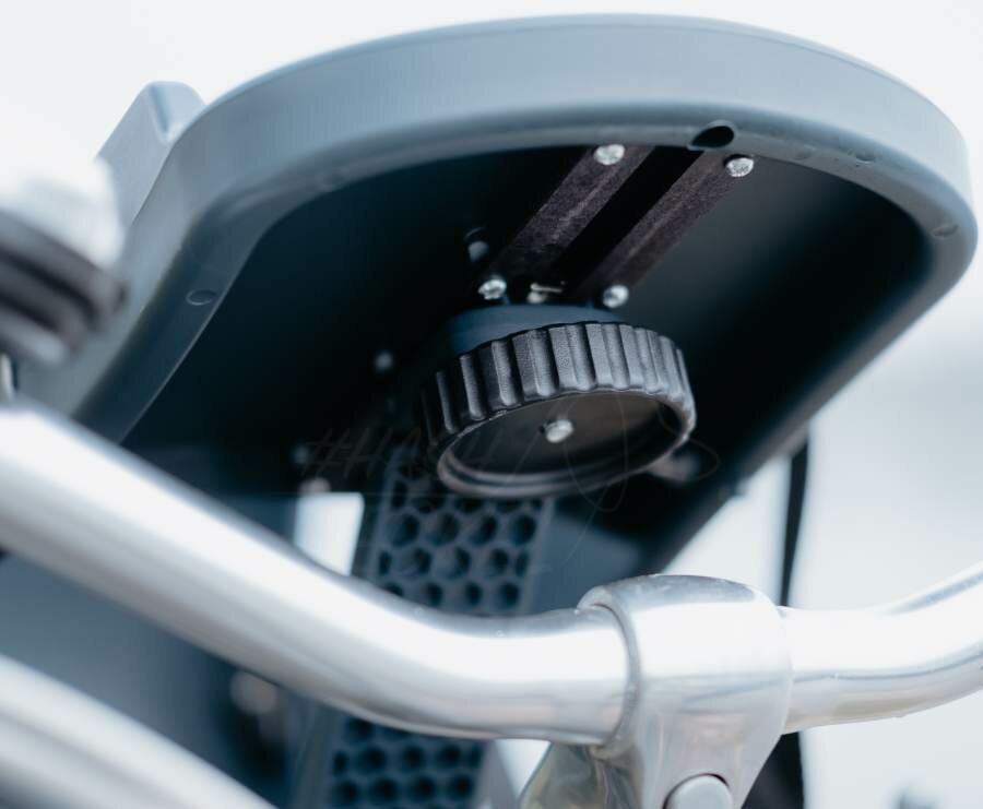 This latest version of the BuddyRider®, version 2, has a rotating component under the platform. This allows you to adjust the platform to the desired height. This can be useful if you have an electric bike with a display, for example, or if you have high handlebars. It's also worth experimenting to find the height that's most comfortable for your Dachshund. Besides the rotating knob that adjusts the platform height, you can also move the BuddyRider forward or backward using the screws under the seat.