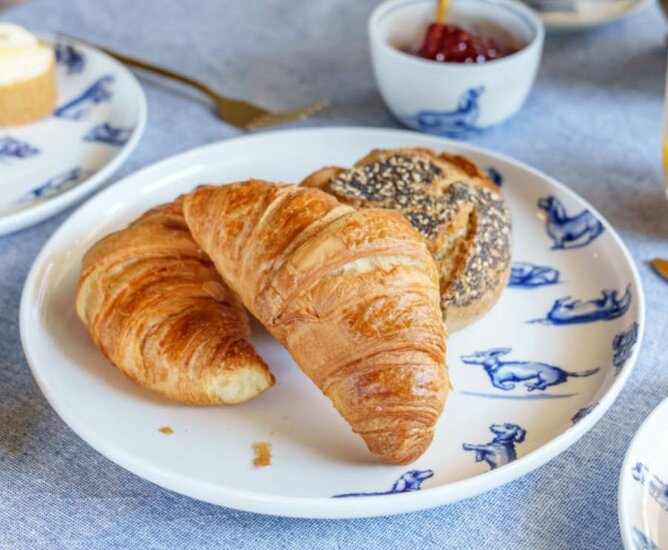 We all know Janny from Heel Holland Bakt, and her dachshund, Nhaan, is regularly featured. She enjoys a lot of baking on the show, which is why this fun dachshund dinner plate from Nhaan was created! The dachshund tableware comes in the traditional Dutch color: Delft blue. It's beautifully finished and can be mixed and matched with all the other tableware from the Nhaan collection . This Dachshund dinner plate will make your dinner a feast and complete your Dachshund tableware. Can you picture your guests sitting down at the table with delicious dishes and this Dachshund dinner plate?