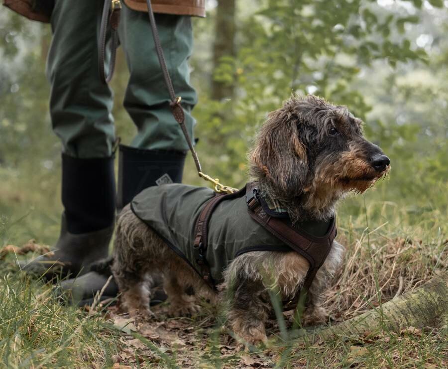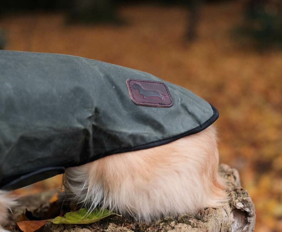 Tough and chic: the perfect wax jacket for your Dachshund ! This wax jacket gives your Dachshund a stylish and functional look. The rugged design and the characteristic signs of wear in the wax create a charming vintage look – completely in the "English gentleman" style. A real eye-catcher! And this jacket is specially designed for the unique build of the Dachshund. Thanks to the extra length, your Dachshund will stay warm and comfortable, even on cold days. No more cold bottoms, and the wide belly band optimally protects the lungs from wind and rain. The water-repellent properties of the wax make this jacket perfect for all outdoor adventures: from a brisk forest walk to a rainy training session in the field. And all with that "hunting vibe."