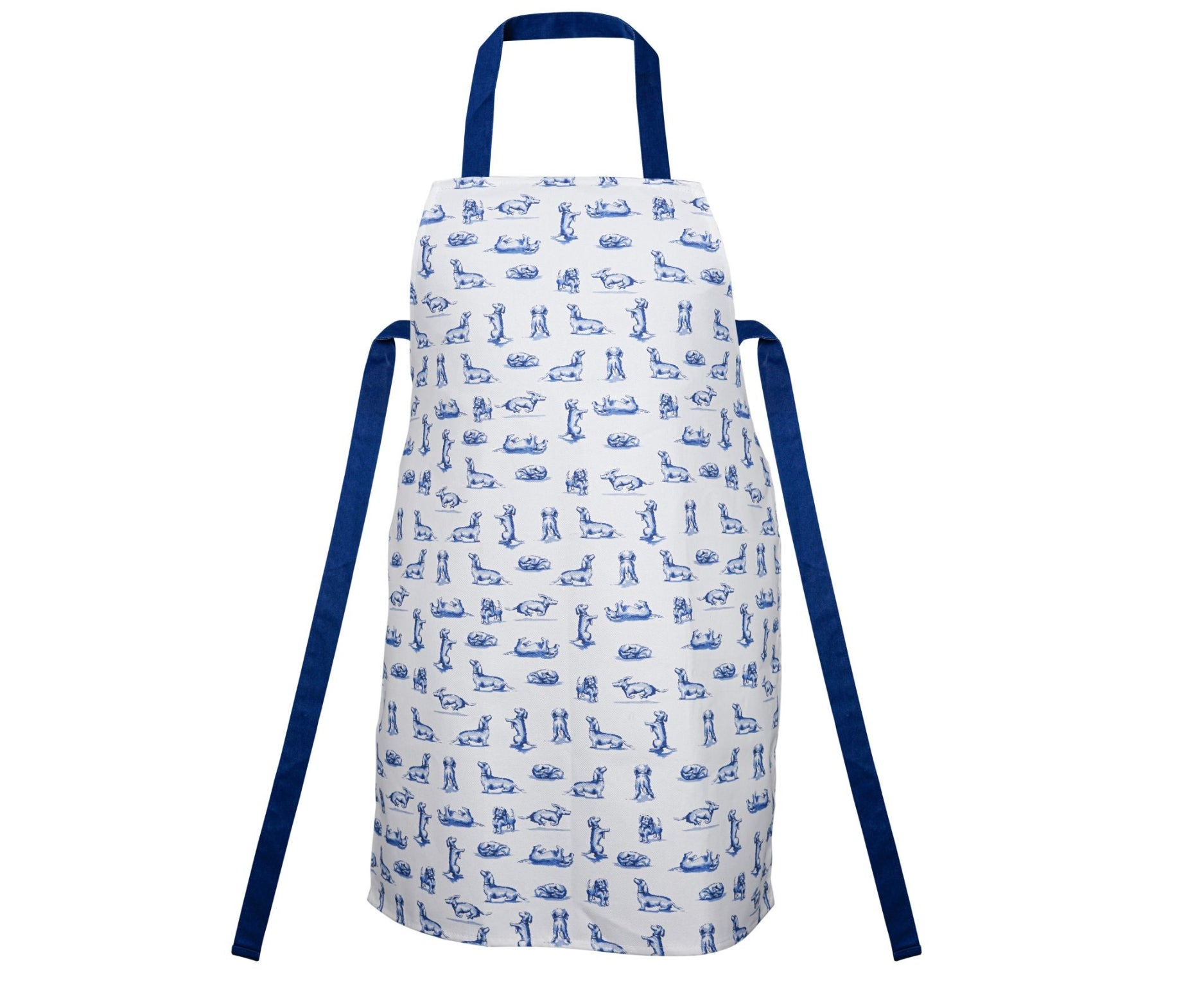 Dit luxe katoenen Teckel schort maakt deel uit van de bekende collectie van Janny van der Heijden in samenwerking met Heinen Delfts Blauw. De vrolijke Teckel Nhaan, het hondje van Janny, staat centraal in deze collectie en is met veel oog voor detail geschilderd in de herkenbare Delfts blauwe stijl.